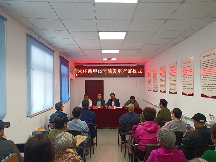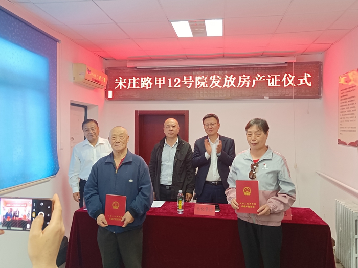 4月25日上午,东铁匠营街道第二社区会议室门前被一团喜庆气氛所环绕。宋庄路甲12号院的54户住户接过期盼已久的房产证,每个人的脸上都洋溢着幸福的喜悦。此时,化工厂“宋庄路甲12号院发放房产证仪式”正在这里举行。