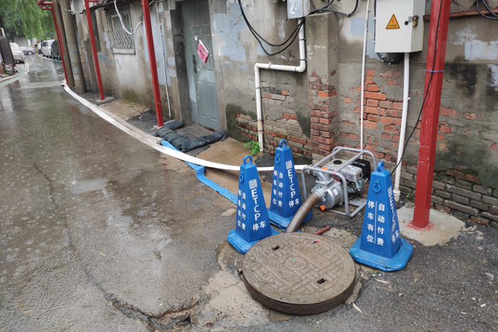 7月29日,在暴雨来袭时刻,北搪公司领导班子和干部职工连夜值守重点点位。大郊亭3号院是老旧平房宿舍区,地势低洼,也是朝阳区防汛重点点位。为应对此次强度大持续时间长的极端暴雨天气,公司在3号院安装了4台汽油排水泵、4台小型电器排水泵,铺设排水管线800米,准备沙袋50个,清理排水雨篦子9个,由于思想高度重视、前期准备工作充分,3号院平安度过这轮强降雨。