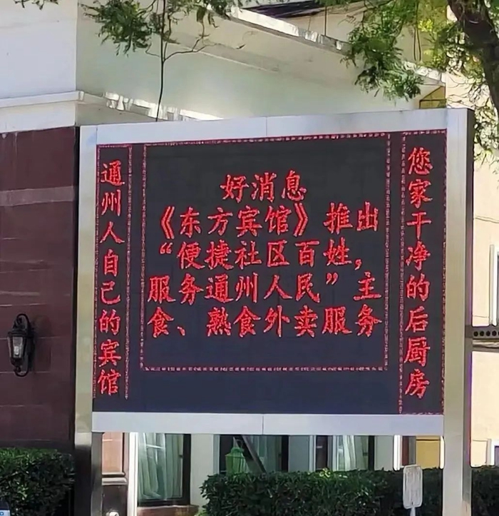 “通州人自己的宾馆,您家干净的后厨房”——北京东方宾馆外硕大的电子显示屏上的红字甚是引人注目。